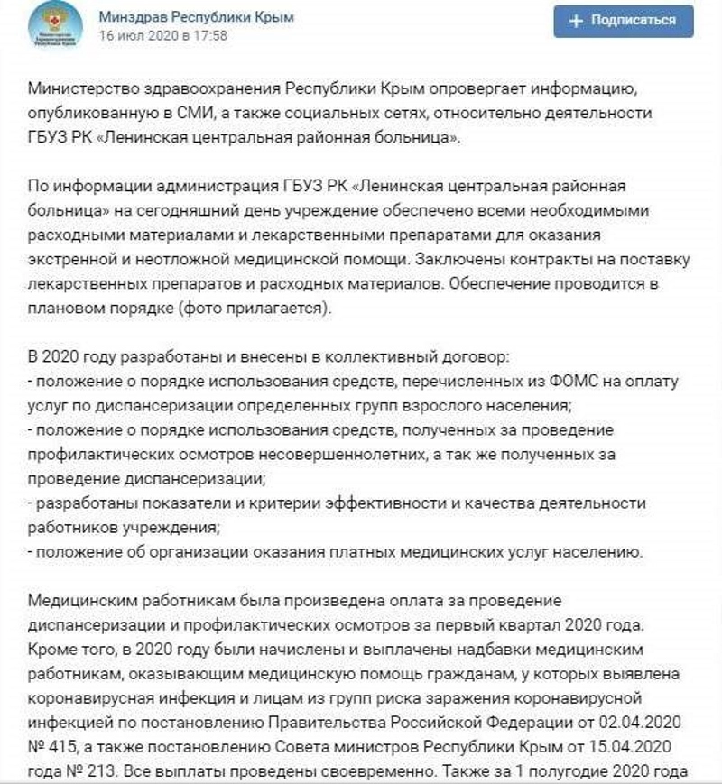 В свою очередь республиканский минздрав принял сторону главврача и, ссылаясь на слова администрации больницы, опроверг опубликованную в СМИ информацию, отчитавшись о полной комплектации больницы всеми необходимыми расходными материалами, а также оборудованием и лекарственными препаратами для оказания экстренной и неотложной медицинской помощи. Однако как выяснилось немного позже, именно главврач в своих отчётах руководству сообщал недостоверные сведения.