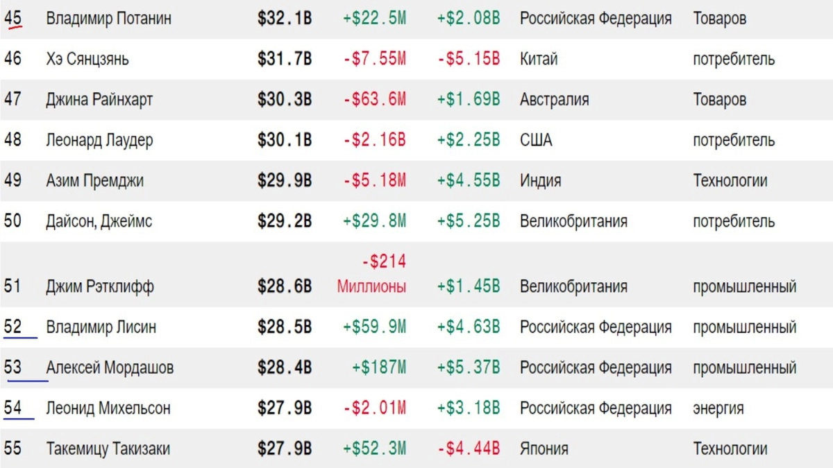 По данным рейтинга Forbes Real-time, Потанин занимает только третью строчку с состоянием в 29,3 млрд долларов. Лисин, как и в рейтинге Bloomberg, остается на второй позиции, но Forbes оценивает его  состояние на один миллиард долларов выше — 29,4 млрд.