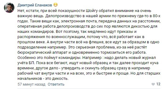 Делопроизводство в нашей армии по прежнему где-то в 80-х годах. Такие вещи, как электронная почта, передача данных на расстоянии, оперативная работа делопроизводств, до сих пор являются дикостью для наших командиров, — отметил пользователь Дмитрий Еланаков.