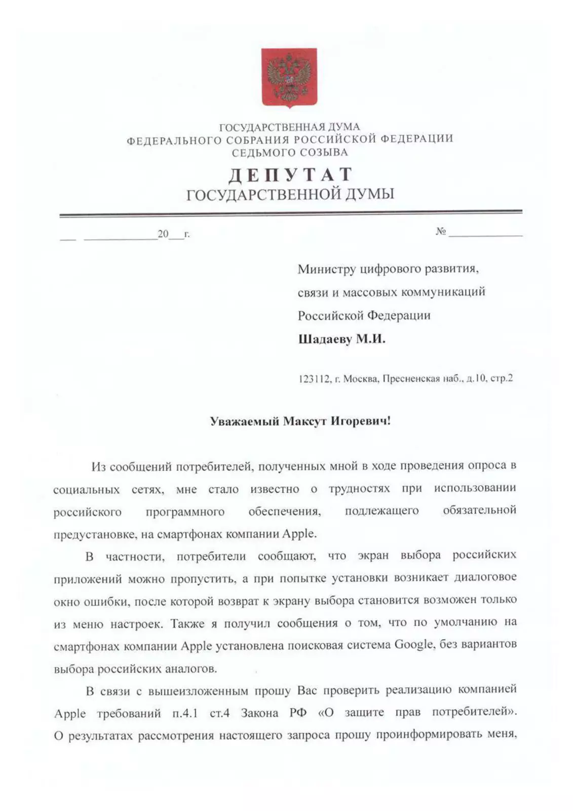 По словам парламентария, некоторые обладатели новых смартфонов iPhone столкнулись с тем, что при запуске на устройстве окна выбора российских приложений система Apple ID выдает ошибку. Другие, утверждает Горелкин, писали в Госдуму, что при активации смартфона можно запросто пропустить окно выбора приложений. Кроме того, покупатели заявляют, что традиционный для iPhone браузер Safari вообще не дает возможности выбрать поисковик.