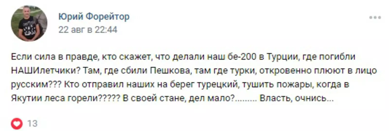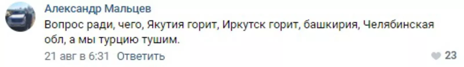 Еще недавно Россия пришла на выручку Турции, территория которой так же, как и ряд регионов РФ, была охвачена лесными пожарами. Их тушили в том числе арендованные Анкарой российские самолеты Бе-200, один из которых разбился о скалы. Трагедия Бе-200 вызвала недовольство пользователей Рунета, которые считали, что самолет гораздо больше пригодился бы в горящих лесах Якутии или Башкирии.