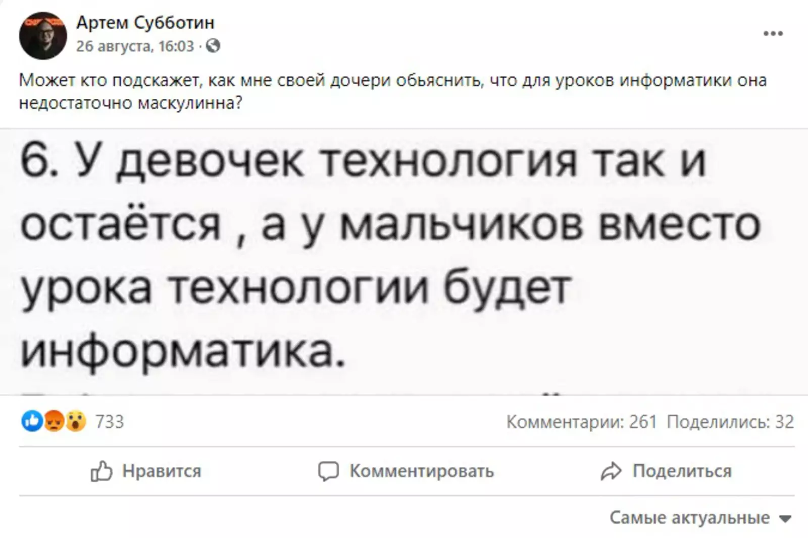 Ранее отец одной из учениц школы Артем Субботин сообщил на своей странице в Facebook, что в ее классе в новом учебном году девочки и мальчики якобы будут заниматься по разной программе — первые продолжат посещать уроки технологии, а вторые вместо этого уже будут осваивать информатику. Свое сообщение Субботин проиллюстрировал скриншотом из переписки с родительским комитетом.