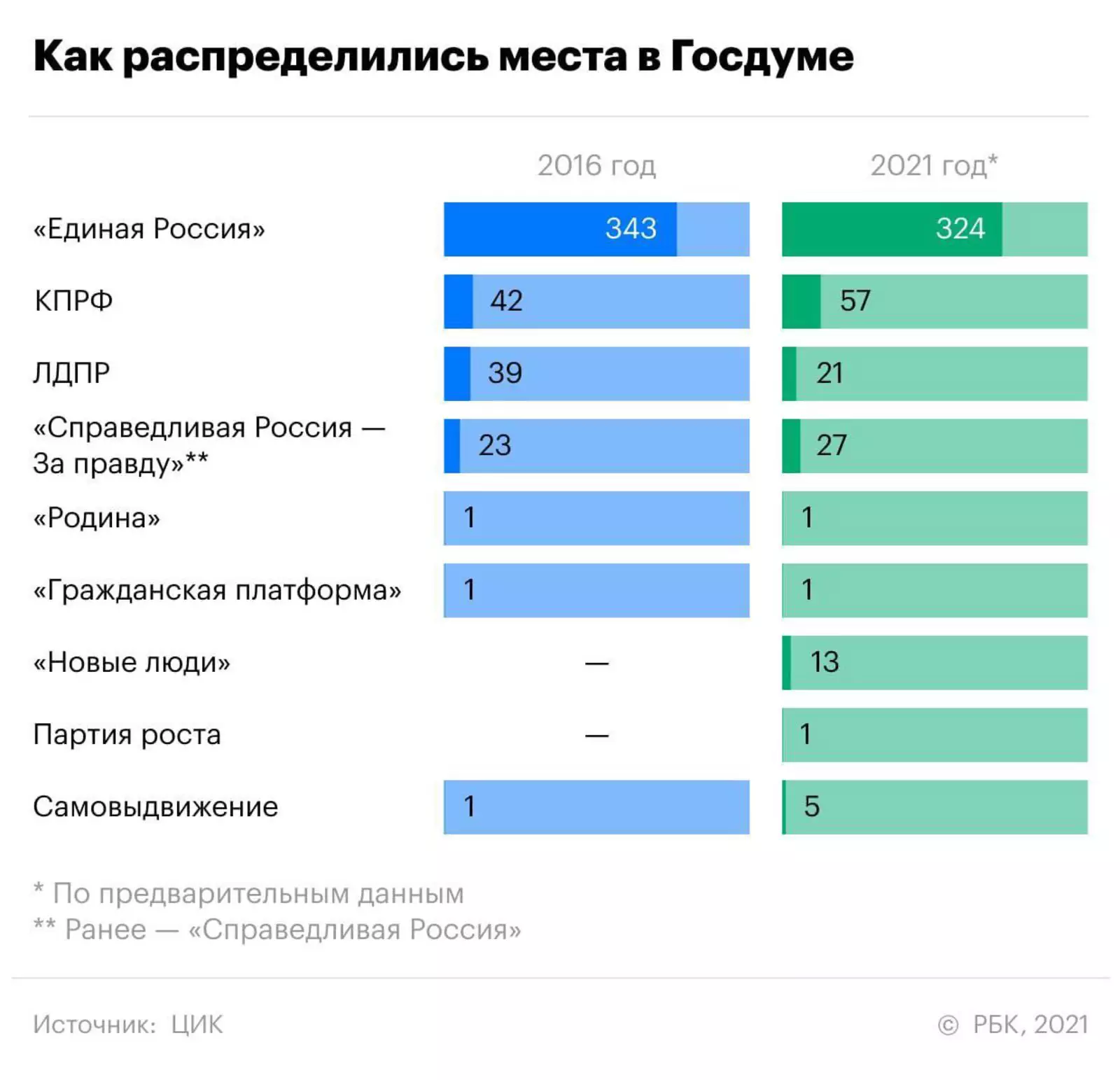 Она добавила, что «Единая Россия» получила в Госдуме 324 мандата, КПРФ — 57 мандатов, «Справедливая Россия» — 27 мандатов, ЛДПР — 21 мандат, а партия «Новые люди» — 13 мандатов, передает ТАСС.