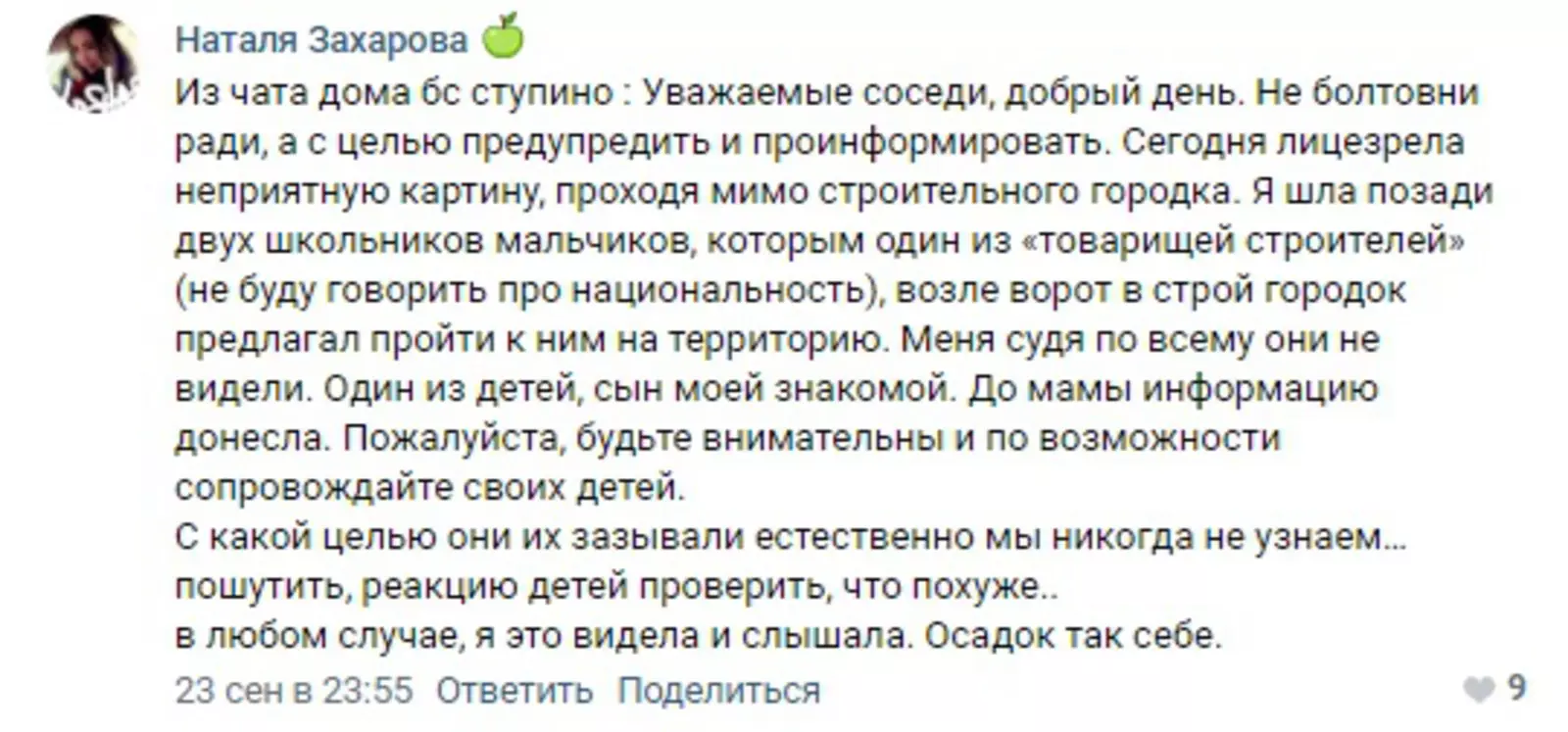 В последнее время межэтническая и межрелигиозная напряженность в Московской области растет. Так, 13 сентября жители поселка Бужаниново под Сергиевым Посадом вышли на народный сход, требуя наказать гастарбайтеров, изнасиловавших и убивших 65-летнюю женщину, и ликвидировать общежитие для мигрантов, где они проживали.