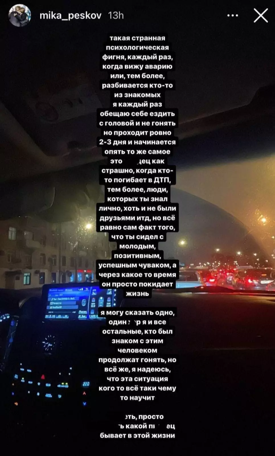 Юноша опубликовал в stories рассуждения о вчерашней аварии на Кутузовском проспекте, в которой погибли блогер Саид Губденский и его товарищ, президент Федерации автомобильного и мотоциклетного спорта Дагестана Заур Ибрагимов.