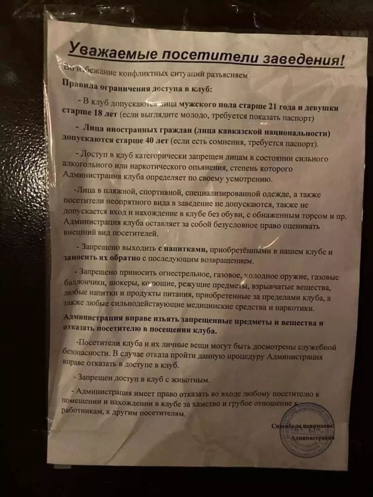Управляющая «Ретро-клуба», представившаяся Альбиной, подтвердила «Ридусу», что такая табличка действительно была на двери клуба и что она действительно отражала его политику.