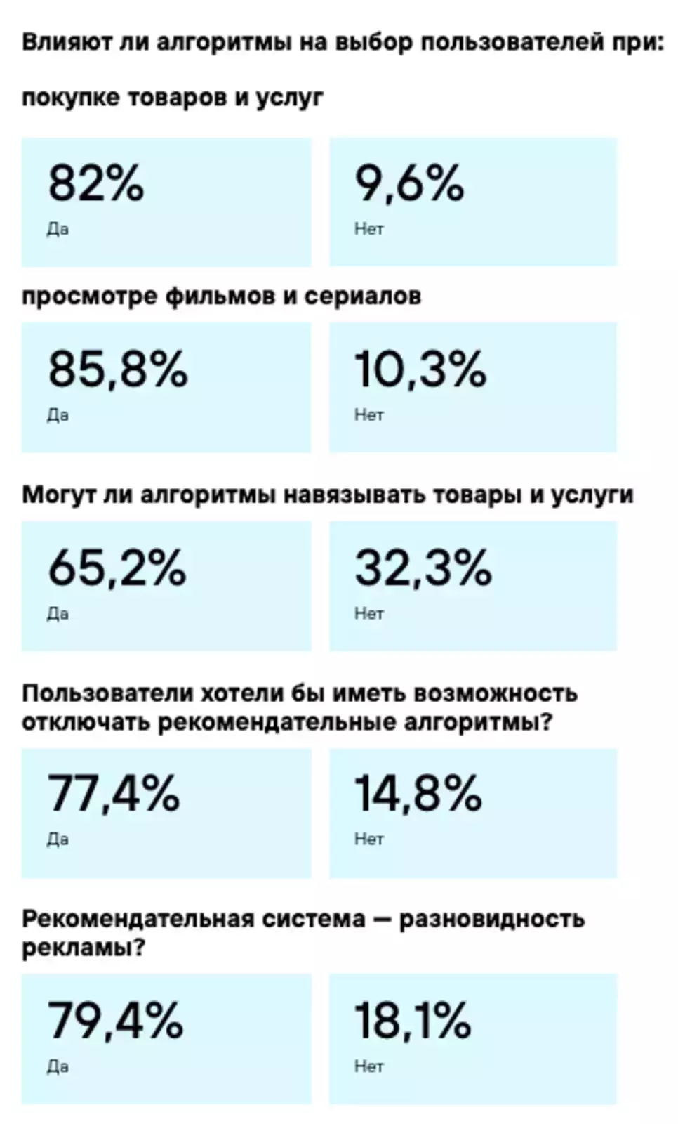 Согласно социологическому исследованию Ассоциации коммуникационных агентств России, две трети представителей отечественной рекламной индустрии считают, что рекомендательные алгоритмы в основном используются для навязывания какого-либо товара или услуги. При этом 77,4% опрошенных хотели бы иметь возможность отключать рекомендательные сервисы.