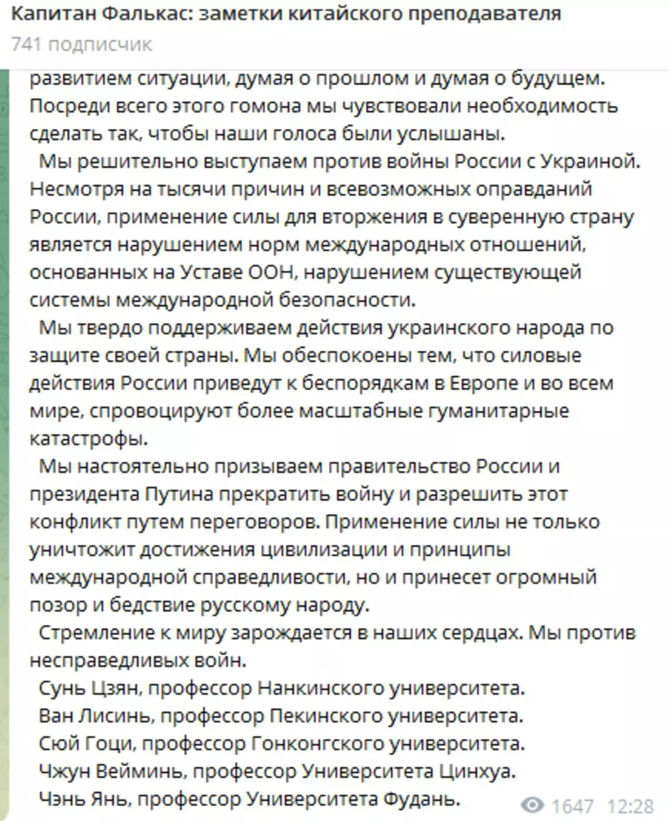 Но с позицией граждан Китая не все так однозначно. Российский Telegram-канал «Капитан Фалькас: заметки китайского преподавателя» опубликовал в русском переводе письмо за подписью пяти профессоров различных университетов КНР и Университета Гонконга, осудивших военные действия.