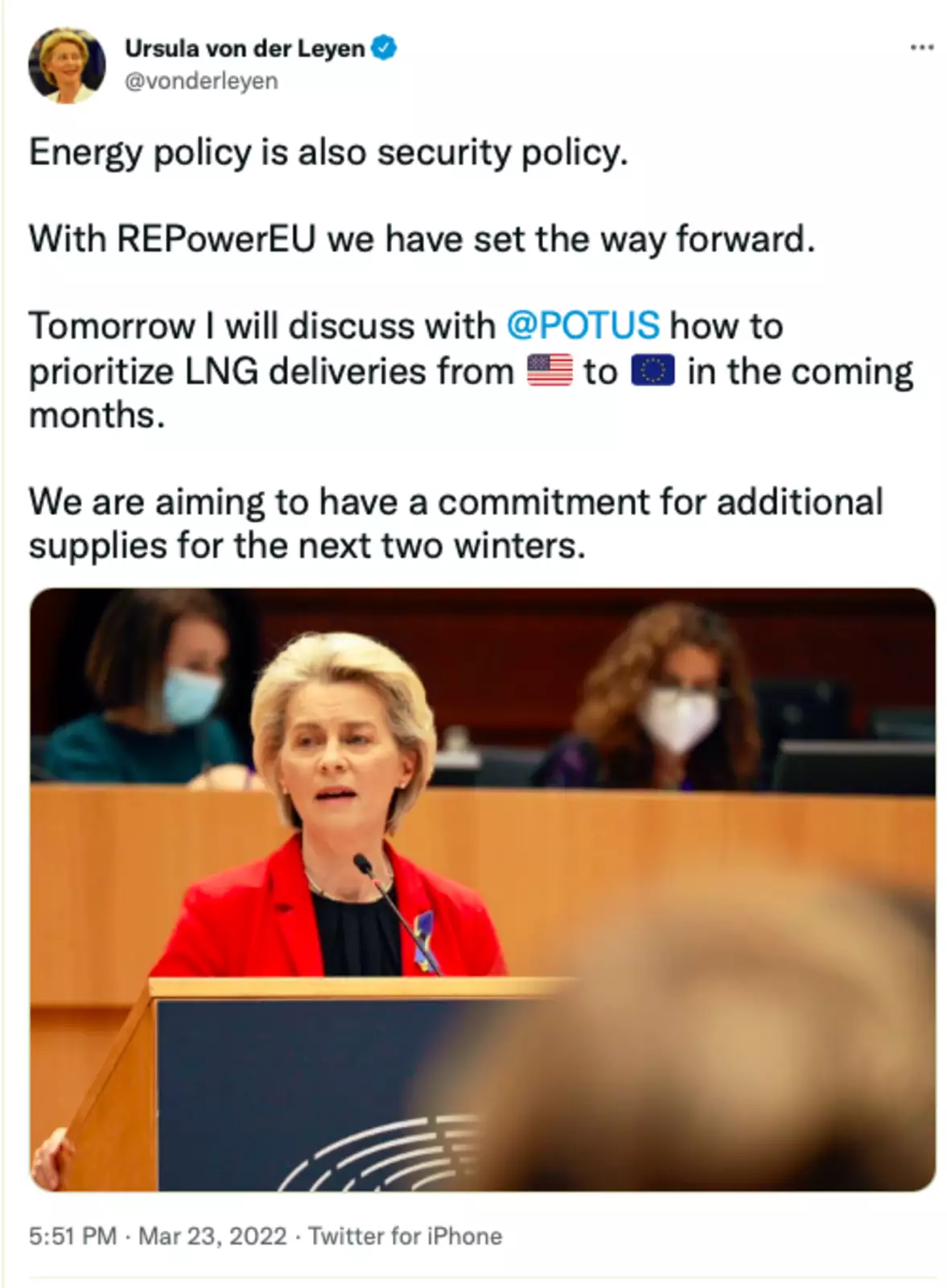 Предваряя соглашение, глава Евросоюза Урсула фон дер Ляйен заявила в Twitter, что энергетическая политика также является политикой безопасности для Европы.