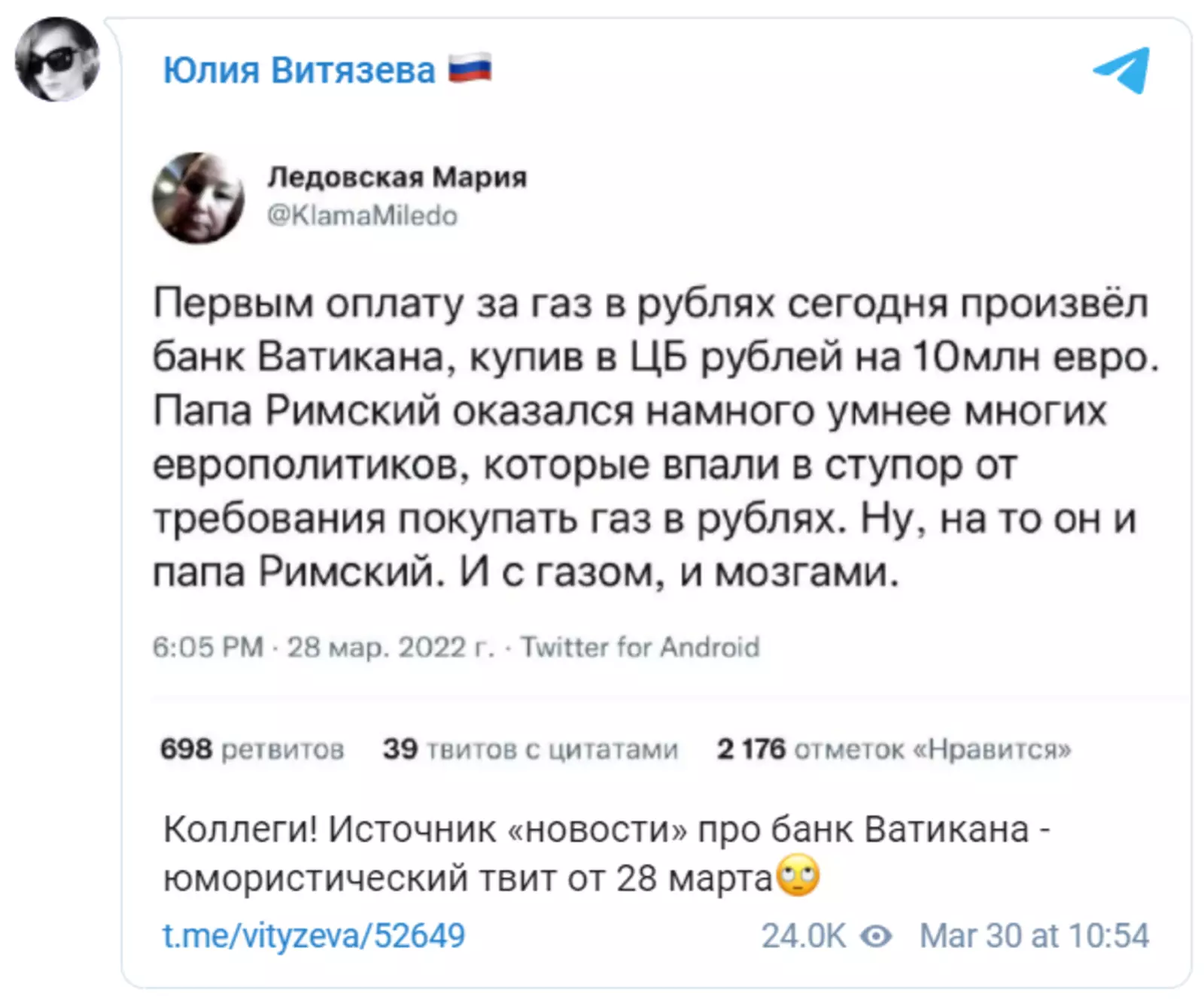 Позже «Царьград» выяснил, откуда у этой информации ноги растут: журналист Юлия Витязева рассказала, что источником сообщения о банке Ватикана является юмористический твит.