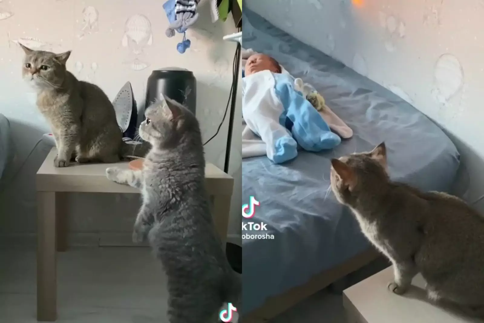 Вот только что прикажете делать, когда двуногие притаскивают домой вместо еды еще одного такого же, только маленького? С такой ситуацией столкнулись коты молодой пары, ведущей TikTok-аккаунт под ником @obrosha. Вернувшись домой из роддома с новорожденным сыном, они записали на видео, как их домашние любимцы среагировали на появление нового члена семьи. И эта реакция покорила платформу.