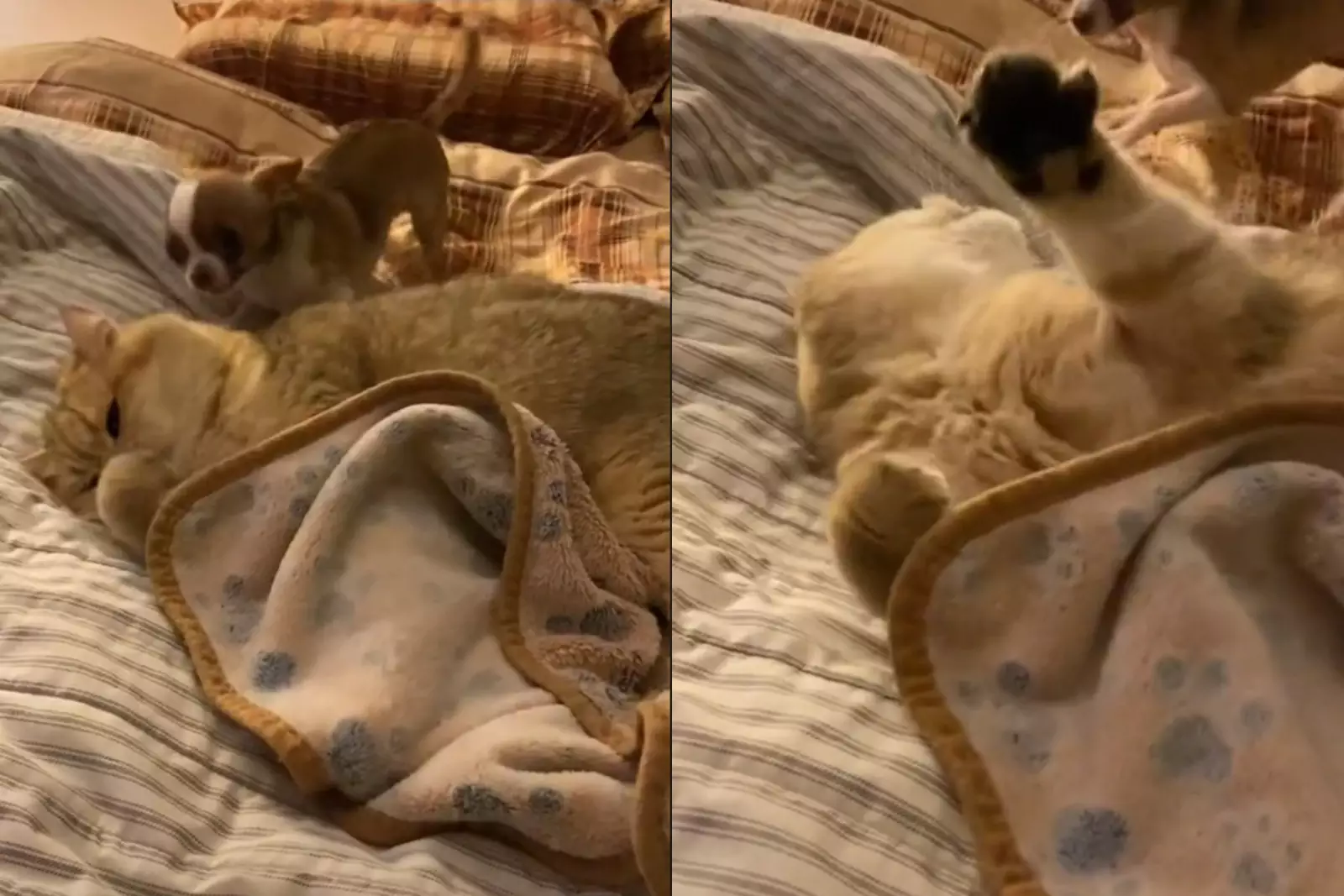 Хозяева питомцев записали на видео, как крошечный собакен атакует своего сожителя с требованием отдать ему плед. На что кот реагирует неожиданно спокойно и мудро. Видео, опубликованное в соцсетях, набрало более 980 тысяч просмотров.