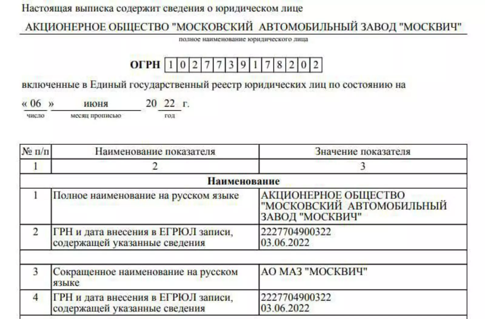 Бывший завод Renault в Москве официально переименован. Его новое название «Москвич» закреплено в Едином государственном реестре юридических лиц России (ЕГРЮЛ).
