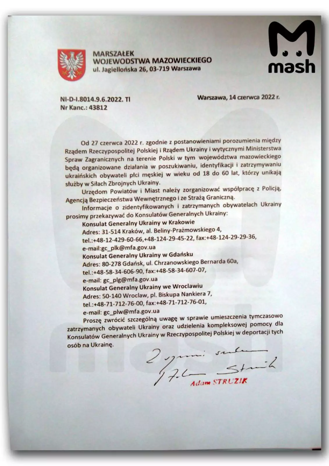 Один из документов подписан главой Мазовецкого воеводства Адамом Стружиком, еще два — от генерального консульства Украины в Кракове и польского МИДа.