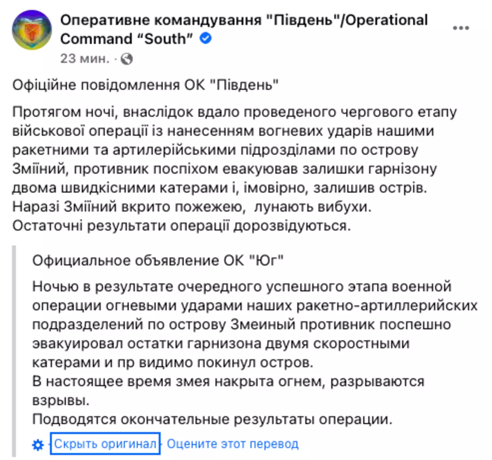 Информацию об уходе армии РФ со Змеиного подтверждают пророссийские Telegram-каналы и Минобороны России.