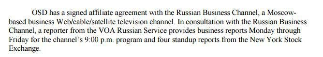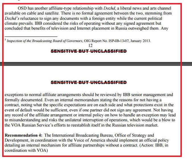 OSD (примечание — структурное подразделение BBG) имеет другой тип сотрудничества с «Дождем», либеральным новостным и культурным (связанным с искусством) каналом, доступным на кабельном и спутниковом телевидении. Формального соглашения между ними нет по причине того, что «Дождь» не желает подписывать какие-либо документы с иностранным юридическим лицом до тех пор, пока превалирует нынешняя политическая обстановка. IBB (примечание — структурное подразделение BBG) приняло во внимание риски проведения работы без какого-либо подписанного соглашения, однако оно пришло к выводу, что преимущества размещения в российском теле- и Интернет-сегменте более важны.