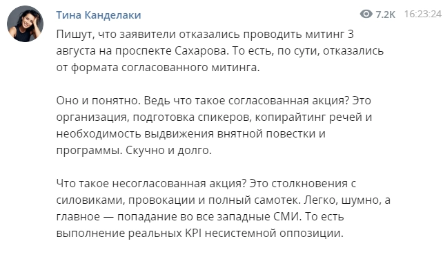 Когда люди хотят выйти за свое правое дело, они выходят туда и так, чтобы это вызвало максимальный резонанс. Согласовали митинг на три улицы дальше — хорошо, пойдем туда. Тухлятина про «нет морального права соглашаться на Сахарова» — это вообще удел совсем нищих мозгом. Но это если считать, что людям нужен митинг. А на самом деле им нужна нездоровая движуха вокруг митинга и как можно больше проблем, — считает эксперт.