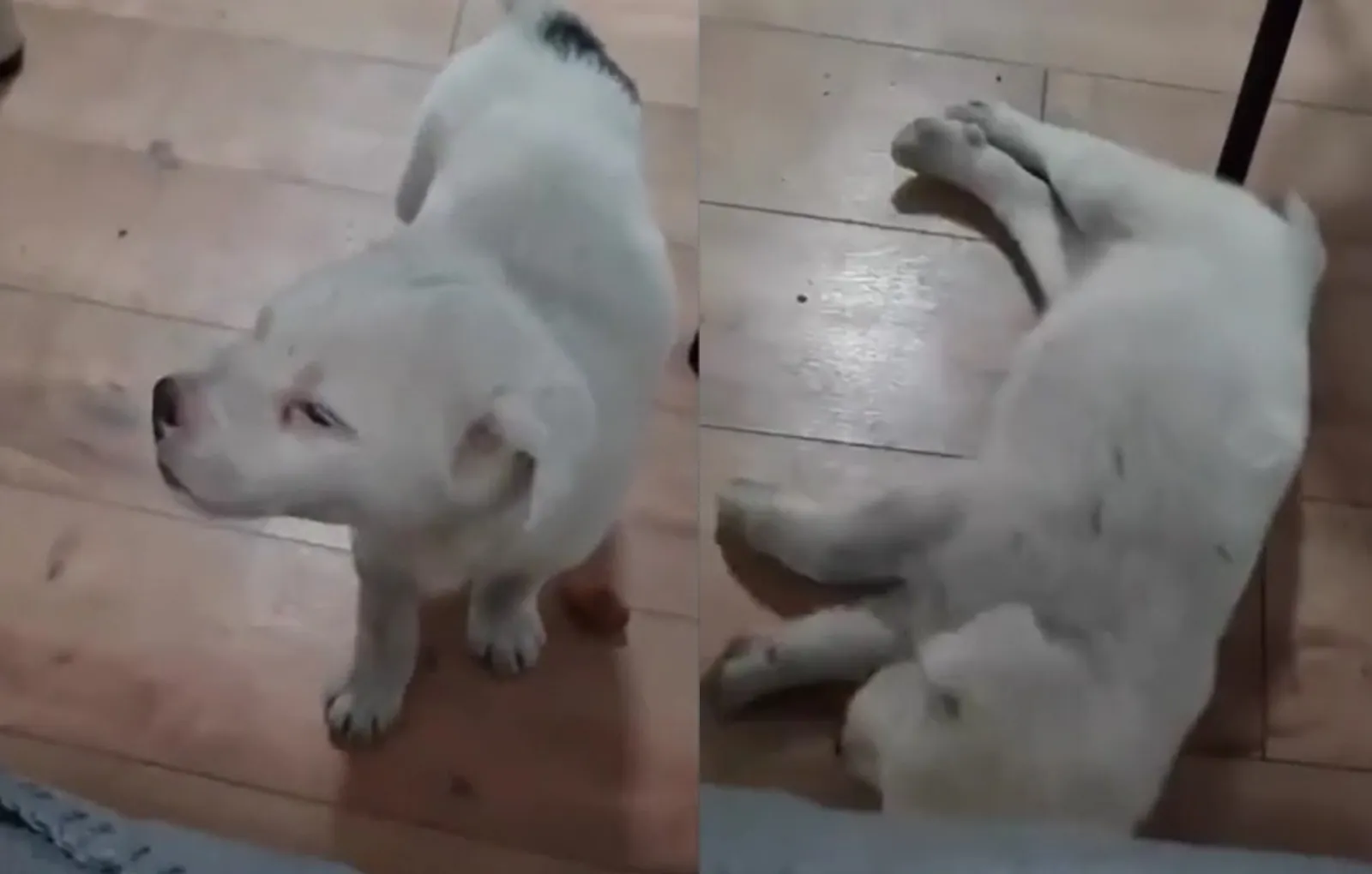 Когда человек взял питомца и поставил его на лапки, собакен простоял пару секунд, зевнул и снова лег на пол, чтобы продолжить спать. Возможно, через пару часов щенок захочет встать и начать новый день. Ну, а пока он предпочитает дрыхнуть без задних лап.