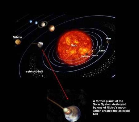 Он утверждает, что Нибиру когда-то столкнулась с планетой под названием Тиамат, расположенной между орбитами Марса и Юпитера. Результатом столкновения планет стало создание пояса астероидов и планеты Земля.