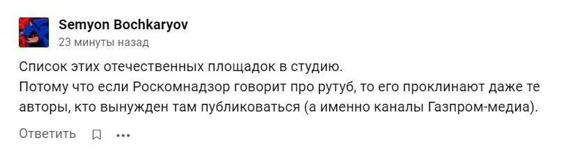 Роскомнадзор рекомендовал средствам массовой информации отказаться от использования YouTube, а материалы публиковать на платформах отечественных интернет-компаний. Свою просьбу специалисты РКН объяснили учащением случаев блокировки контента западными платформами, что может ущемлять свободу российских СМИ в целом и каждого отдельного журналиста в частности.