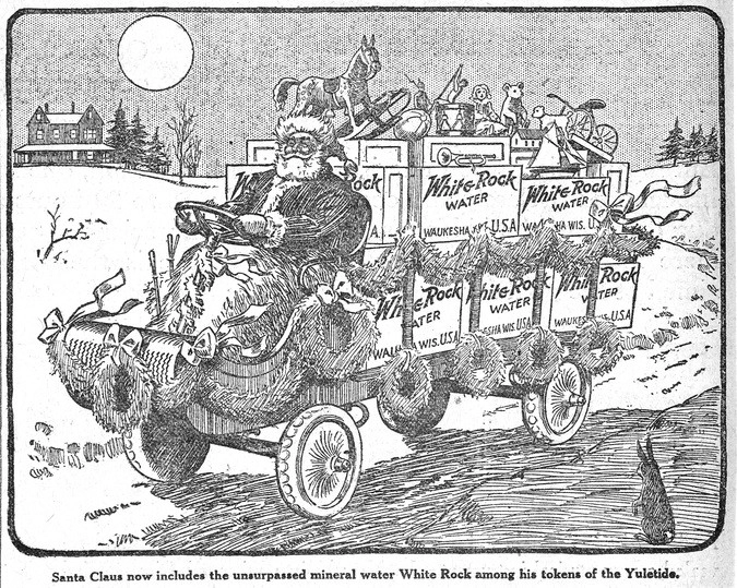 В декабре 1915 года Санта засветился на страницах The San Francisco Examiner в рекламе содовой «Уайт Рок». Он вез ящики с минералкой на грузовике. На следующее Рождество Санта рекламировал «Уайт Рок» в New York Herald, причем доставлял ящики с водой уже на самолете.