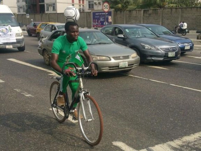 Нигерийский футболист на велосипеде с мячом на голове проехал 103 километра