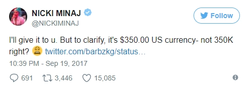 Ники Минаж пообещала выслать фанату из Бишкека 350 долларов