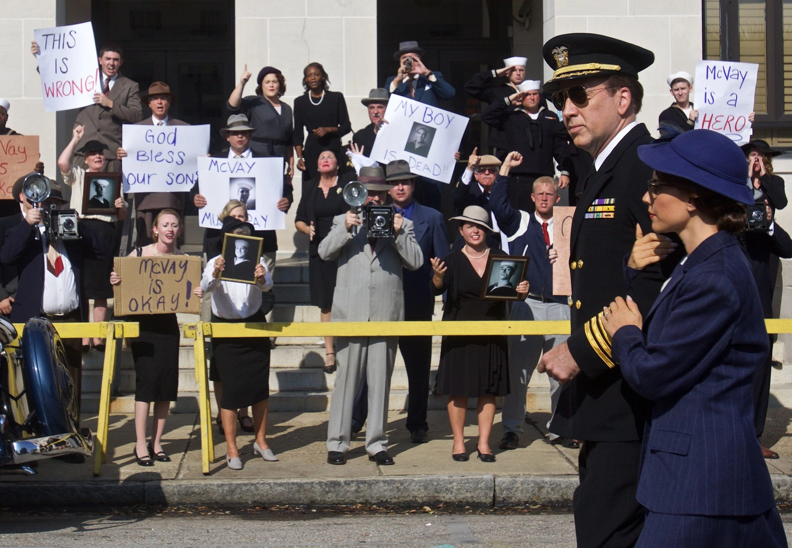 Последние про сам фильм спрашивали немного — вопросов шесть, из которых два повторяли друг друга, а прочие крутились вокруг одного и того же. Кейдж послушно рассказал, что готовился к съёмкам со всей тщательностью: знакомился с материалами и документами по теме, провёл своё собственное исследование вопроса. «Это самое трагическое, худшее происшествие на флоте в истории моей страны», — говорит он и уверяет собравшихся: «Я не сделал ничего такого, что было бы исторически недостоверно».