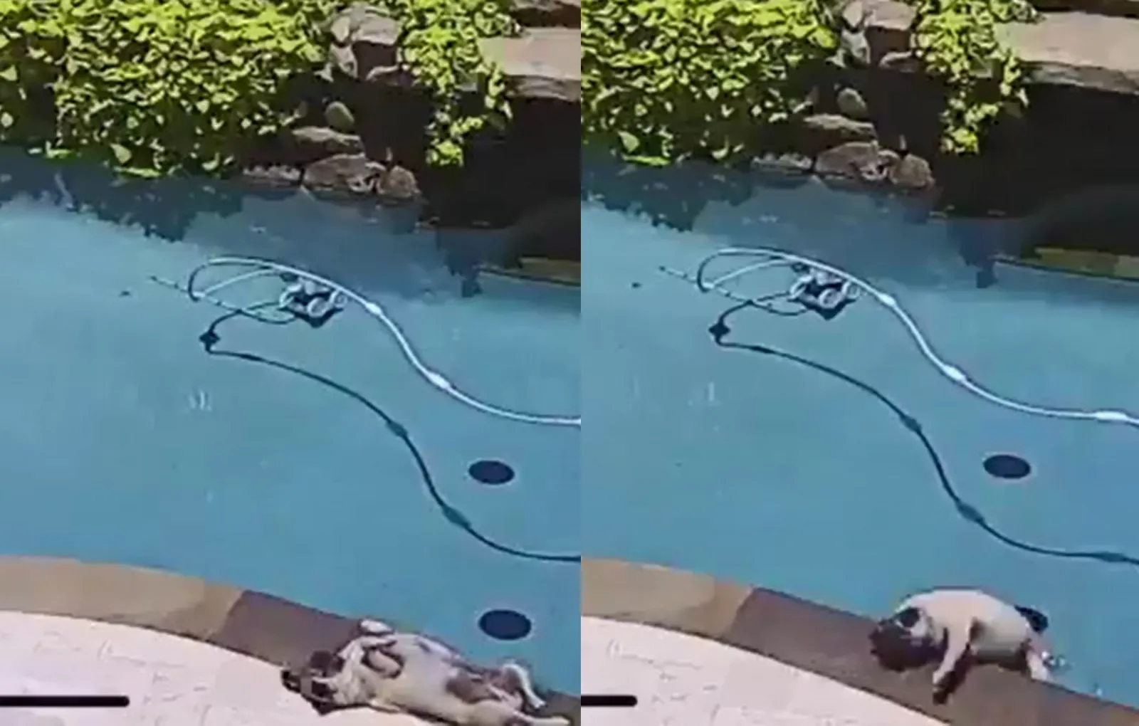 Но вот Людо решил перевернуться на другой бок и... внезапно свалился в бассейн. Наверняка мопс хотел, чтобы про его фиаско никто не узнал, но эпичное падение в воду было снято домашней камерой видеонаблюдения.