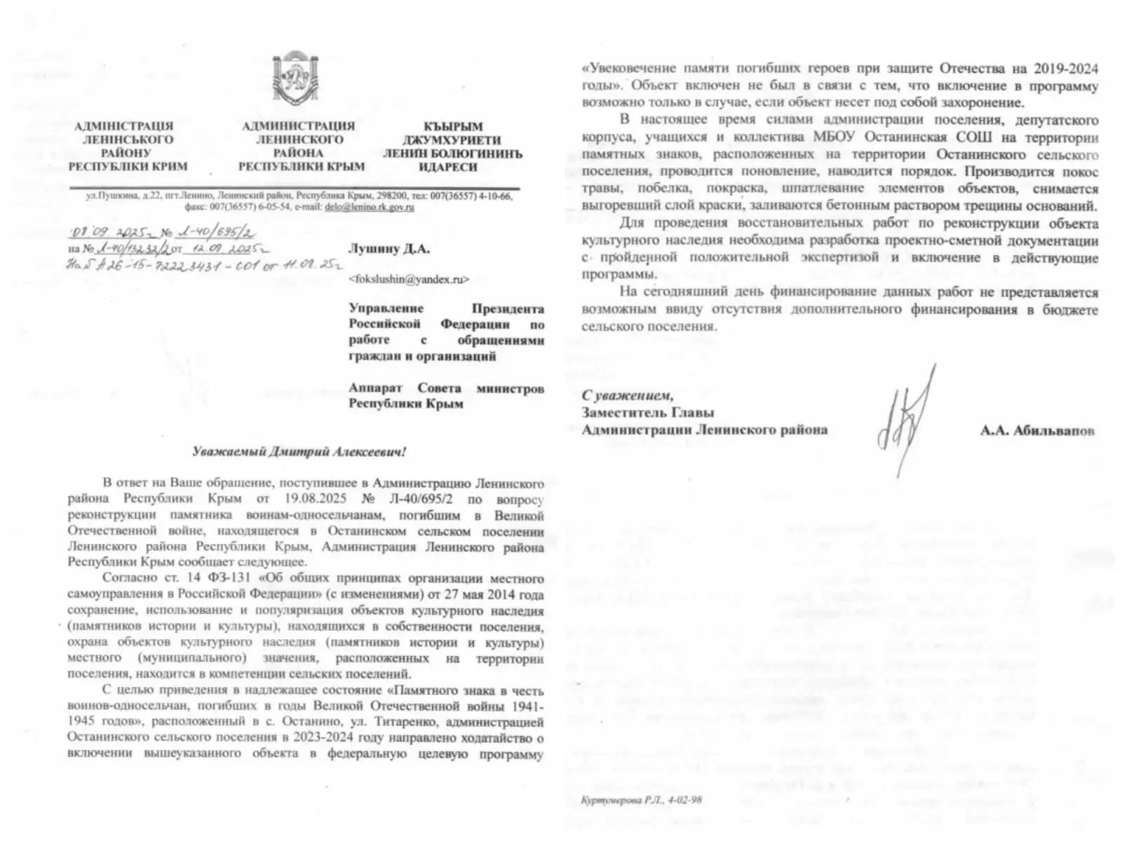 Не только местные жители, но и поселковые власти пишут обращения к главе Крыма Сергею Аксёнову, в республиканский государственный совет и к депутатам Госдумы с просьбой сохранить памятник и включить данный объект в федеральную целевую программу «Увековечение памяти погибших героев при защите Отечества». В ответ заявители получают отговорки о том, что включение в программу возможно только в том случае, если объект несёт под собой захоронение, а проведение восстановительных работ по реконструкции объекта культурного наследия не представляется возможным по причине отсутствия проектно-сметной документации и денежных средств на ремонт. Сколько требуется средств — не сообщается.