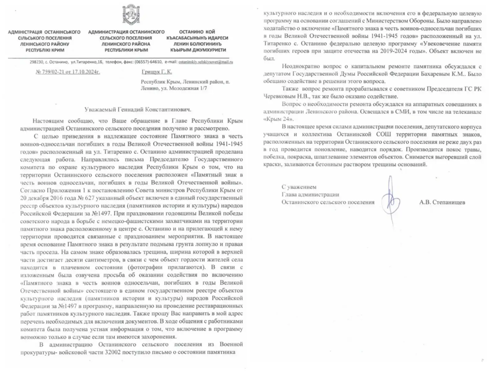 В селе Останино Ленинского района Республики Крым разрушается памятный знак в честь воинов-односельчан, погибших в годы Великой Отечественной войны, отнесённый к категории объектов культурного наследия России.