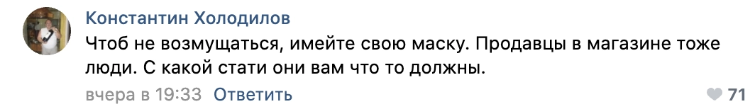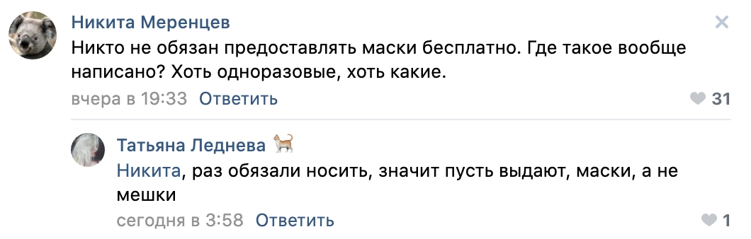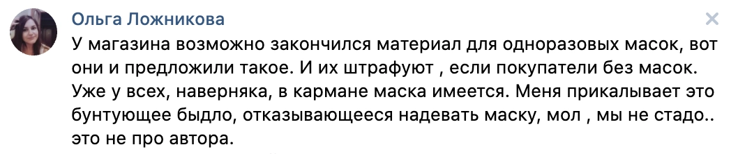 «Сам факт того, что они не придумали ничего более умного, как нарезать пакеты и предлагать вместо масок. То есть и покупателей мы не хотим терять, но поскольку у нас больше ничего нет — напяльте пакет и идите. Ну, скоро нам что — мешки на голову наденут и скажут ходить? Это перебор», — заключила Булахова.