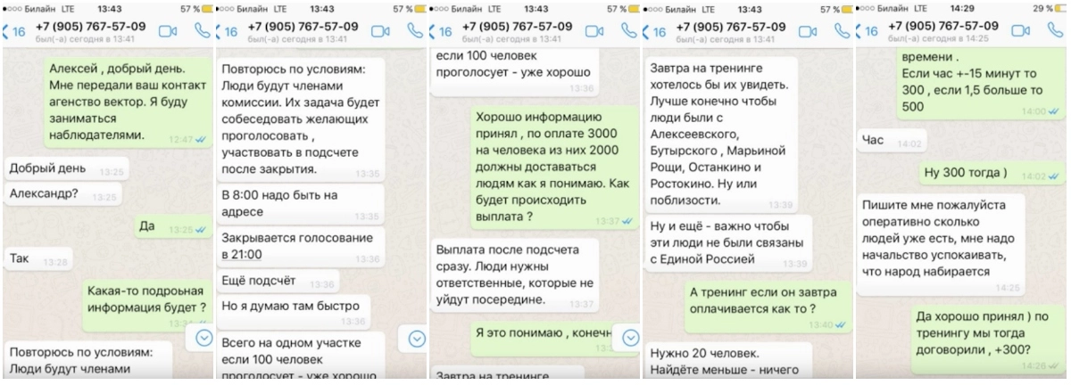 Видеоряд также содержит скриншоты переписки человека, «занимающегося наблюдателями». Судя по номеру телефона, возможно, это предприниматель Алексей Калитвинов.