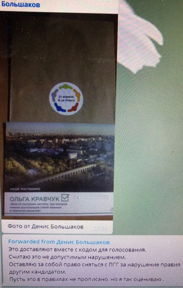 Ранее был зафиксирован еще один скандал в 14-м избирательном округе: штаб кандидата в мундепы по району Ростокино Ольги Кравчук вместе с кодом для интернет-голосования рассылал и рекламу кандидата.