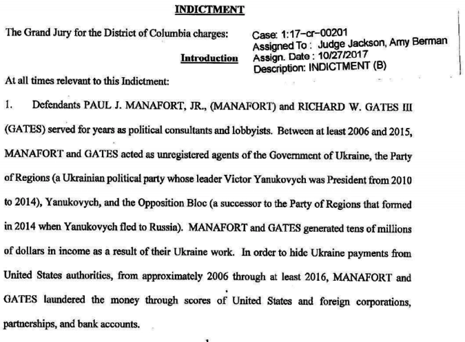 На данный момент известно, что обвиняемые в «сговоре, направленном против США, с целью отмывания денежных средств, действиях в качестве незарегистрированного агента иностранной державы, ложных и вводящих в заблуждение заявлениях о том, что касается положений Закона о регистрации иностранных агентов, а также непредоставлении информации об активах в иностранных банках и о финансовых счетах», Манафорт и Гейтс не признали вину в суде ни по одному пункту. Обвиняемые помещены под домашний арест до тех пор, пока за них не будет внесен залог.