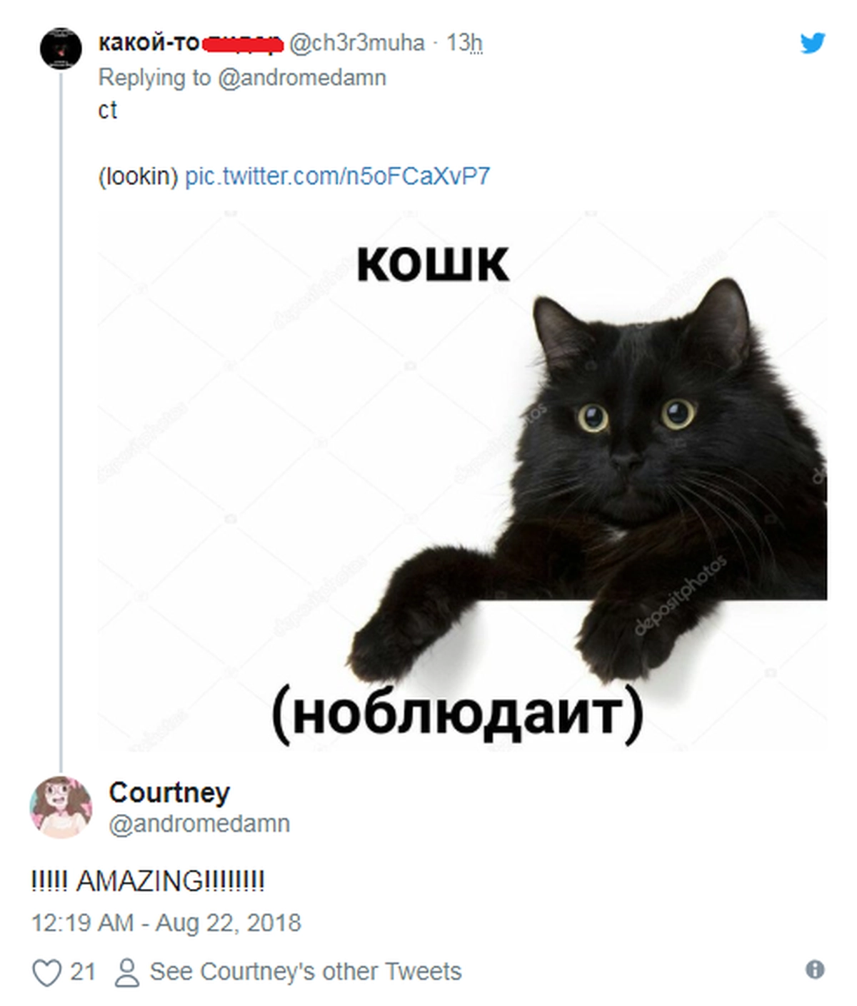 Фраза, в которой допущено целых три ошибки, по неизвестной причине стала очень популярным мемом. С его помощью теперь изображают любого затаившегося человека или животное.