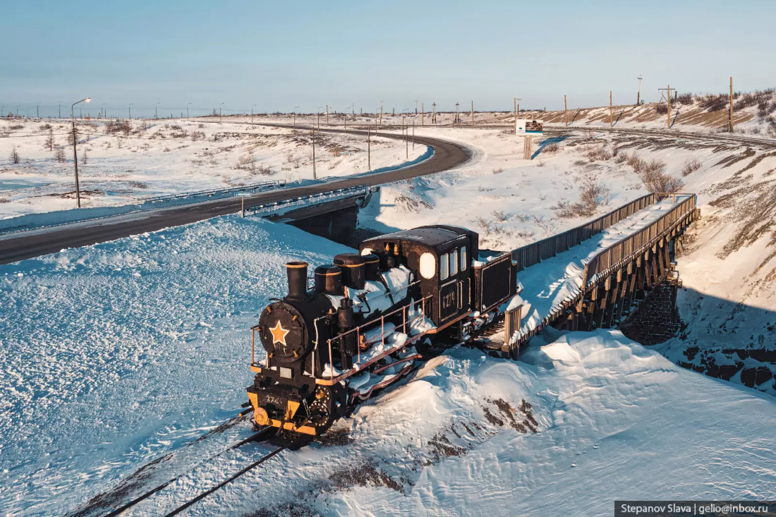 60. Паровоз Гр-274 — памятник времён первой железной дороги, которая соединяла Норильск и Дудинку. Когда ресурсов узкоколейки стало недостаточно, построили дорогу с нормальной шириной колеи и в 1952 году начали демонтировать старые пути. Но когда решили установить памятник строителям и железнодорожникам, выяснилось, что паровозов и вагонеток не осталось. Подходящий паровоз нашли на Украине, морем доставили в Дудинку и установили только в 1992 году.