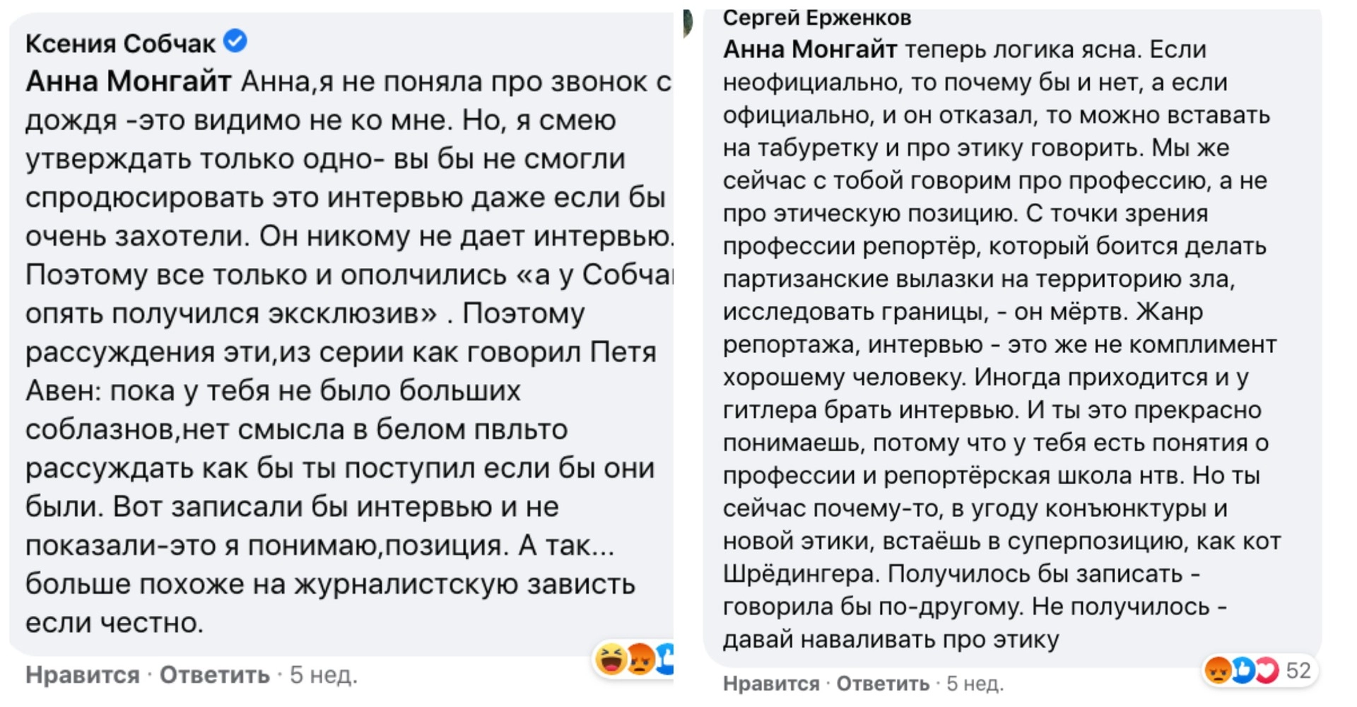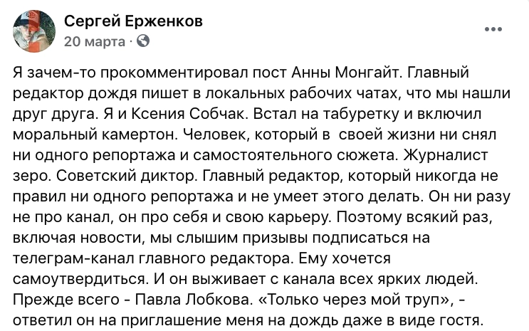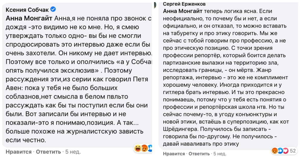 Несмотря на все заверения Монгайт, что «Дождь» «не хотел брать [у Мохова] интервью, даже не пробовал», Ерженков слово в слово повторял тезисы Собчак о журналистской зависти.