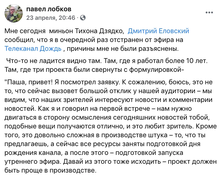 Итог немного предсказуем: Лобков написал в Facebook, что руководство канала приняло решение о его увольнении.