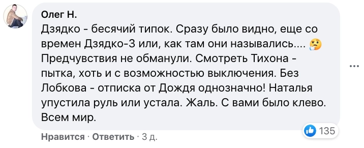 Лобков, как и его друг Ерженков, определили главного редактора «Дождя» Дзядко своим главным врагом. Не стесняясь в выражениях, они на весь Facebook критиковали руководство канала за то, что Дзядко решил избавиться от скандального сотрудника.
