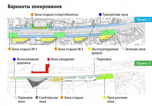 Второй вариант - менее вызывающий и предлагает построить вдоль улицы велодорожку, рядом с бывшим казино "Метелица" оборудовать скейт-парк, а за ним - парковую зону. Для подъема же на крыши двухэтажных строений предлагается сделать светящиеся лестницы с навесами.
