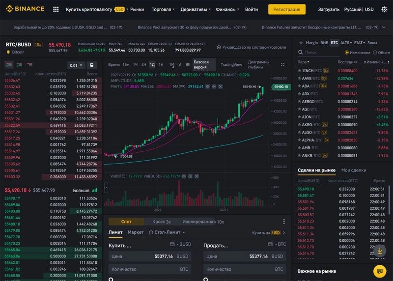 Биткоин продолжает устанавливать исторические рекорды. Вечером 19 февраля стоимость одной из самых популярных криптовалют на торгах на бирже Binance выросла на 6,9% и достигла отметки 55,5 тысячи долларов.