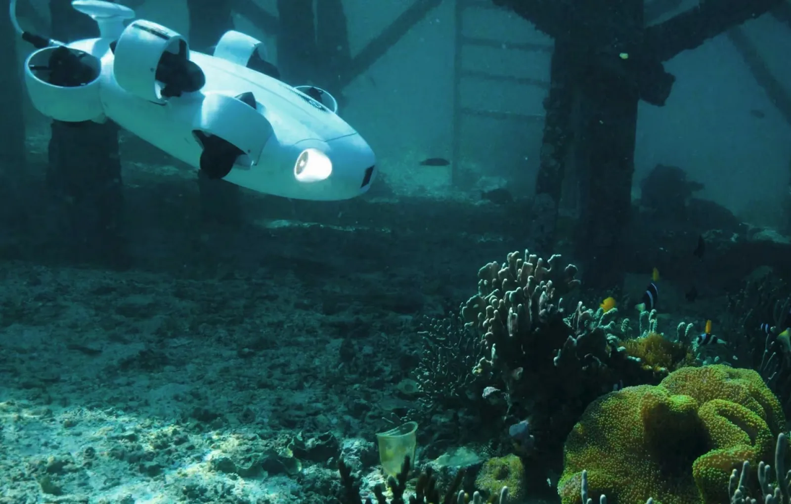 В случае с V-EVO длина троса составляет 100 метров, — на такую глубину может погружаться дрон, чтобы снимать подводную жизнь на свой широкоугольный объектив с углом обзора 166 градусов и разрешением 4К. На большой глубине, где воды слишком тёмные, камере помогают два светодиодных прожектора, а программное обеспечение устройства улучшает изображение на основе искусственного интеллекта, отфильтровывая в кадре планктон.