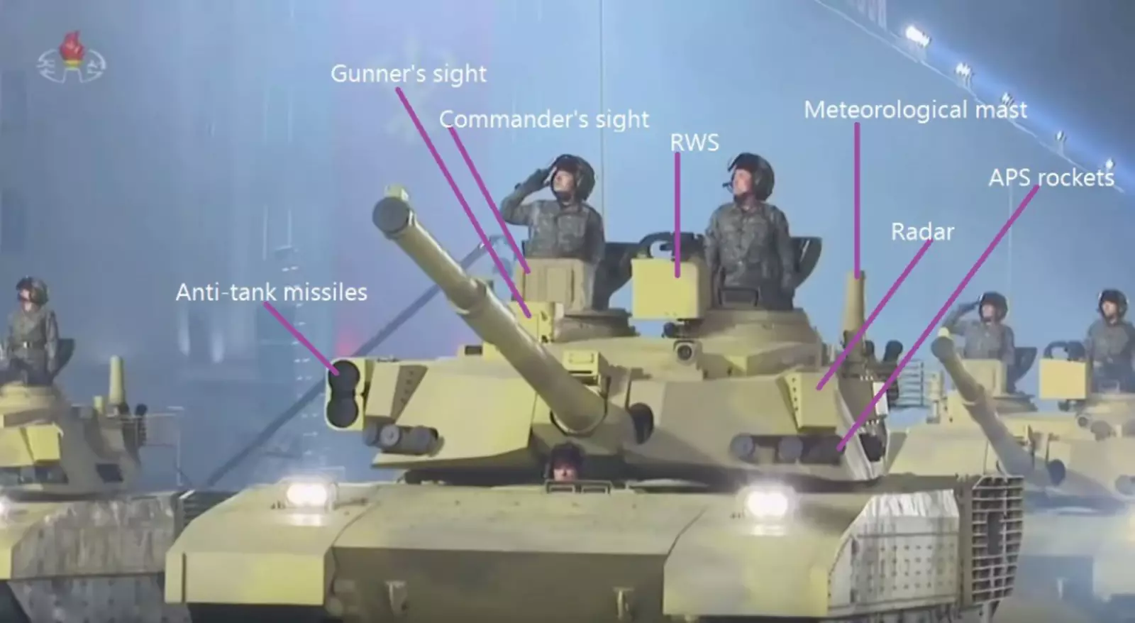 Окрашенный в коричневый цвет и ощетинившейся вооружением танк, получивший в СМИ условное название «М-2020» — пример эволюции северокорейской военной техники. Новая модель может похвастаться удлиненным корпусом и угловатой башней, напоминающей башню южнокорейского танка K1, известного также как Type 88.