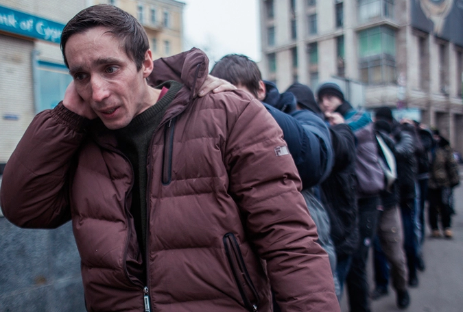 Участники акции протеста на площади Независимости ведут предполагаемых провокаторов, так называемых "титушек". © Андрей Стенин/РИА Новости