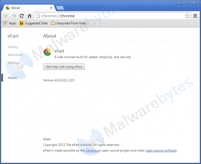 Заметить запись об eFast можно в настройках или напечатав в адресной строке «chrome: // chrome». После обнаружения вредоносного браузера авторы статьи рекомендуют удалить запись «eFast 000.110010107».