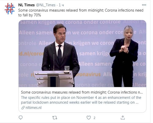 Министр здравоохранения Гуго де Йонге заявил, что надеется на еще один «осторожный промежуточный шаг в середине декабря», поскольку стране необходимо отпраздновать Рождество. «Больше мы сможем узнать об этом в начале декабря», — цитирует NL Times слова премьер-министра.
