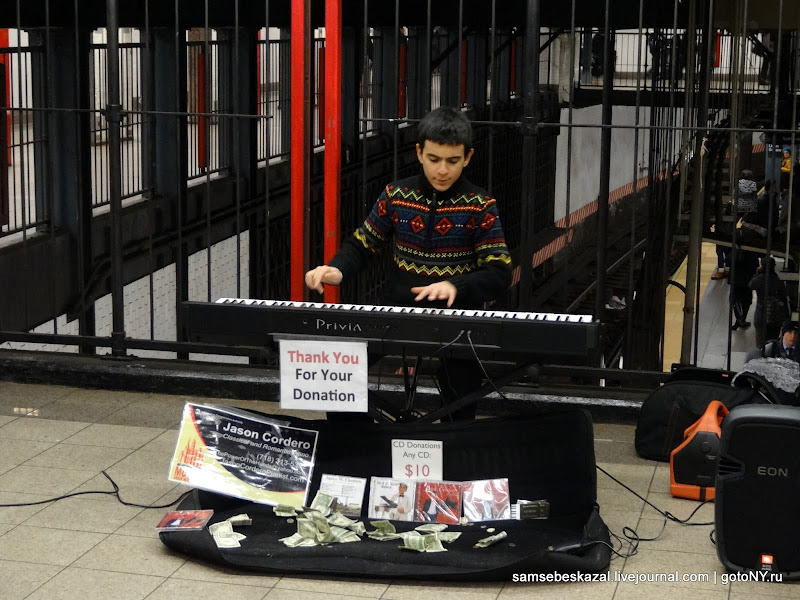 14-летний мальчик Jason Cordero играет классическую музыку в переходе станции Union square (видео). Отец в это время стоит рядом и продает его диски. Jason играет в метро уже не первый год. При этом учится в школе и является отличником. В Нью-Йоркской подземке есть специальная программа нацеленная на работу с талантливыми музыкантами. Согласно сайту МТА "350 артистов и исполнителей проводят около 7 500 музыкальных концертов в течении года в 30 различных местах нью-йоркского сабвея." Все они проходят специальное прослушивание, которое проводится каждую весну на балконе вокзала Гранд-Централ. Получив одобрение специальной комиссии они могут выступать в отведенных местах не мешая проходящим пассажирам и не создавая излишнего шума. Еще есть достаточно приличное количество нелегальных музыкантов (или легальных, но нарушающих правила), которые работают прямо в вагонах, исполняя песни и танцы в перегонах между станциями.