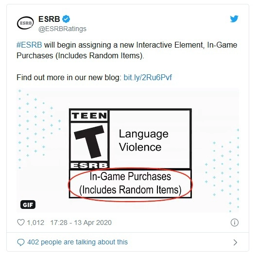Новое предупреждение называется «включает в себя случайные предметы» и будет назначено всем играм, которые включают в себя покупки с любыми рандомизированными элементами.
