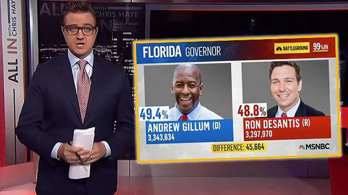 Промежуточные выборы в США начались со скандала: в своем утреннем новостном выпуске телеканал MSNBC продемонстрировал диаграмму, свидетельствующую об итогах губернаторских выборов во Флориде, в которых соперничают республиканец Рон Десантис и демократ-афроамериканец Эндрю Гиллум.